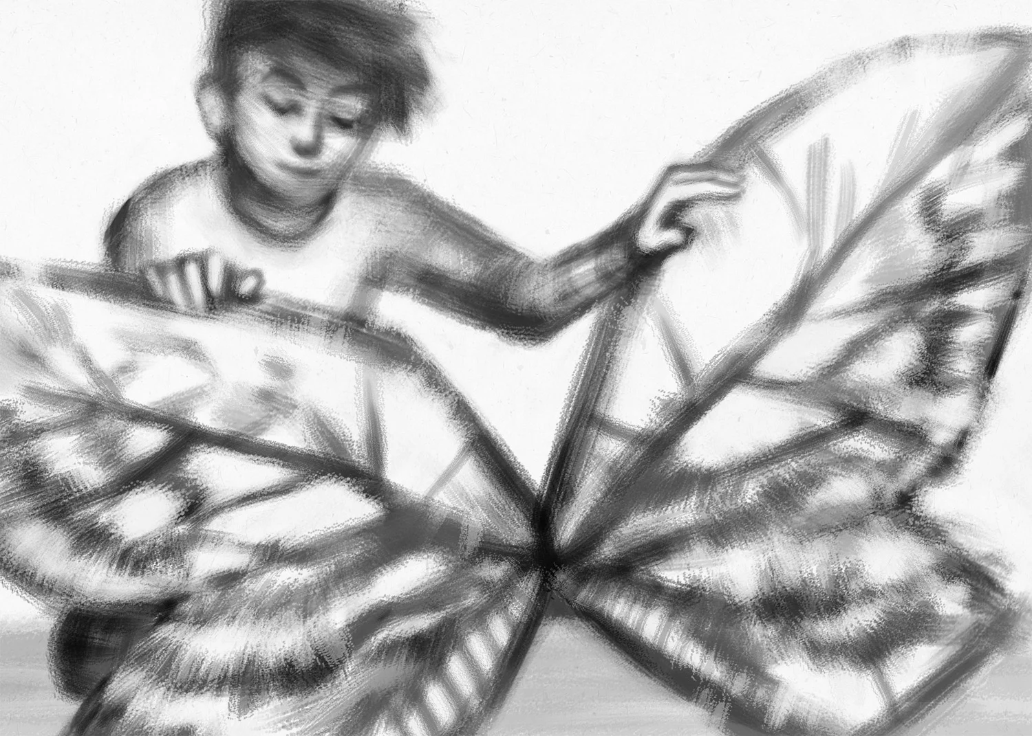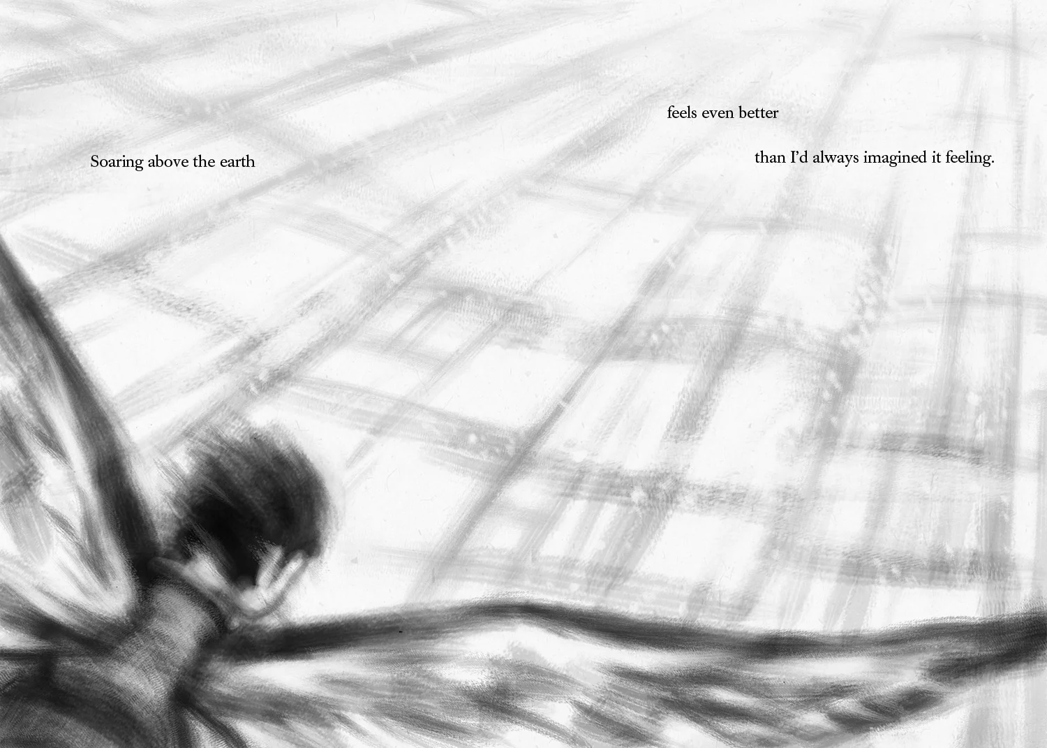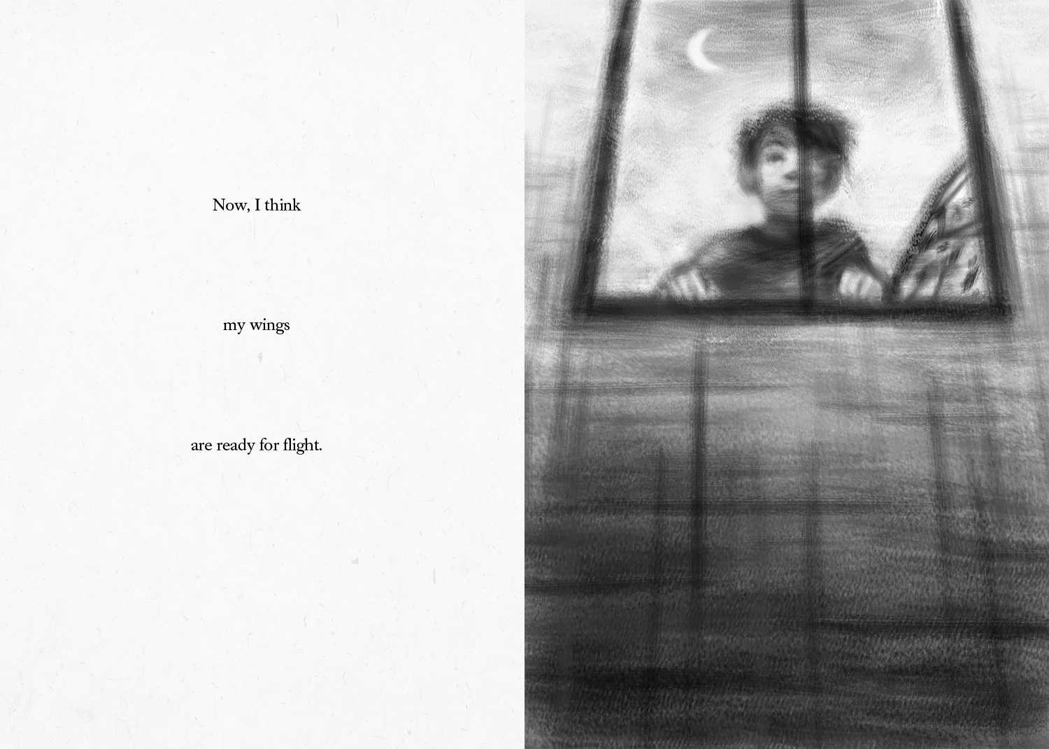 On the way home from school in a dreary grey city, a young boy finds a feather that will help his dreams take flight.